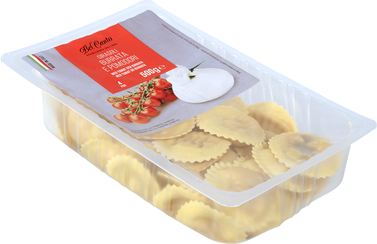 | Ingredienser | Fyll 63%: Ricotta ost (myse (melk), fløte (melk), salt, surhetsregulerende middel: sitronsyre E330, melkesyre E270), burrata ost 10% (melk, fløte (melk), salt, løpe), mozzarella ost (melk, salt, løpe), brødkrum (hvetemel, salt, gjær), mysepulver (melk), fløte (melk), soltørket tomat 5%, solsikkeolje, laktose, Grana Padano PDO ost (melk, salt, løpe, konserveringsmiddel: lysozym fra egg E1105), basilikumpasta 2,5% (basilikum, solsikkeolje, salt, surhetsregulerende middel: natriumbikarbonat E500), tomatpuré 2%, soltørket tomat 1,8% (tomat, salt), salt. Pasta 37%: Hvetemel, egg 28%, durumhvete semolina. |