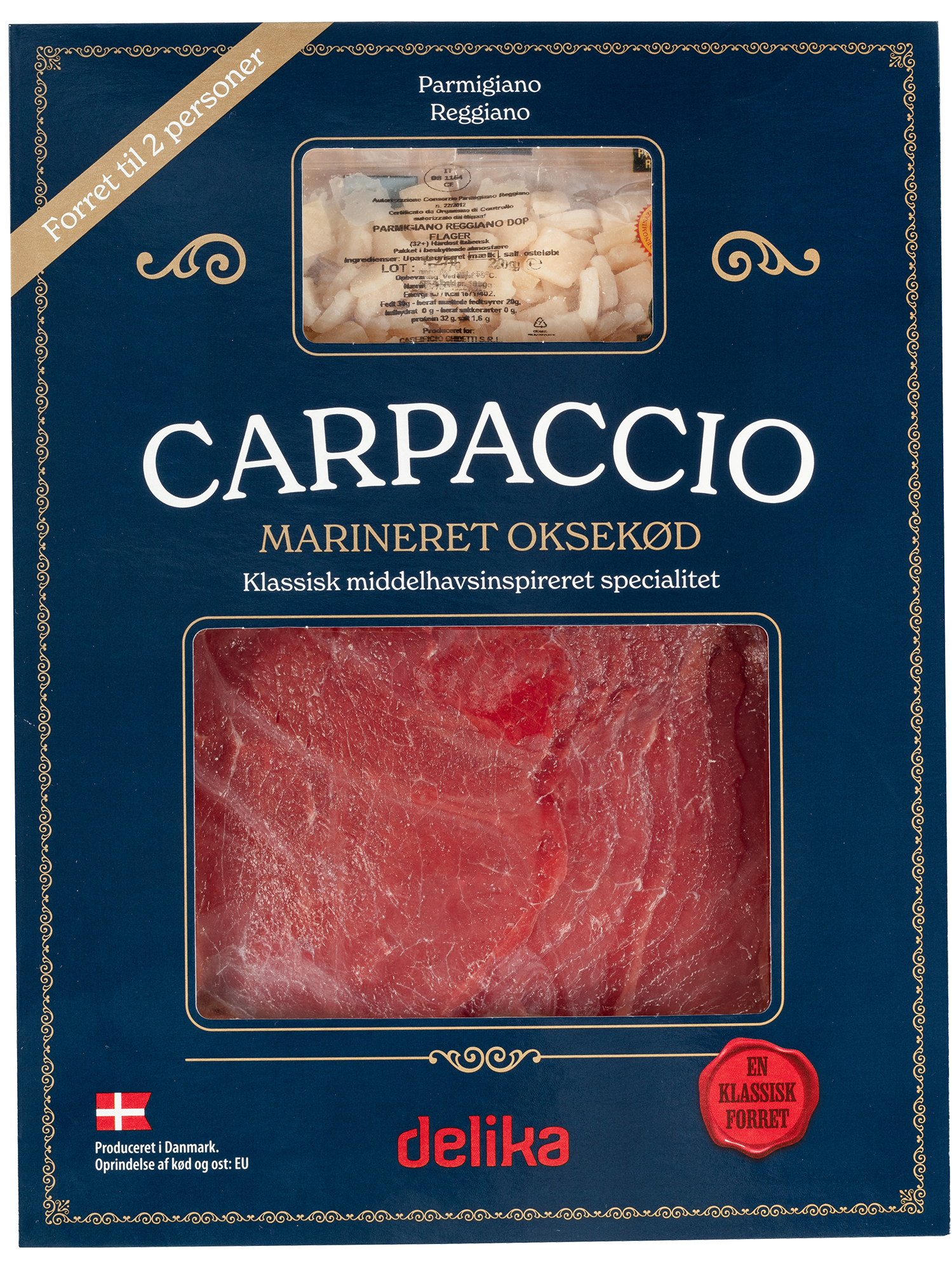| Ingredienser | Carpaccio: Oksekjøtt (filet) 97%, salt, vann, dekstrose, surhetsregulerende middel: natriumacetat E262, natriumlaktat E325, antioksidant: natriumaksorbat E301, konserveringsmiddel: natriumnitritt E250. Parmiggiano Reggiano DOP ost: upasteurisert kumelk, salt, animalsk løpe. |