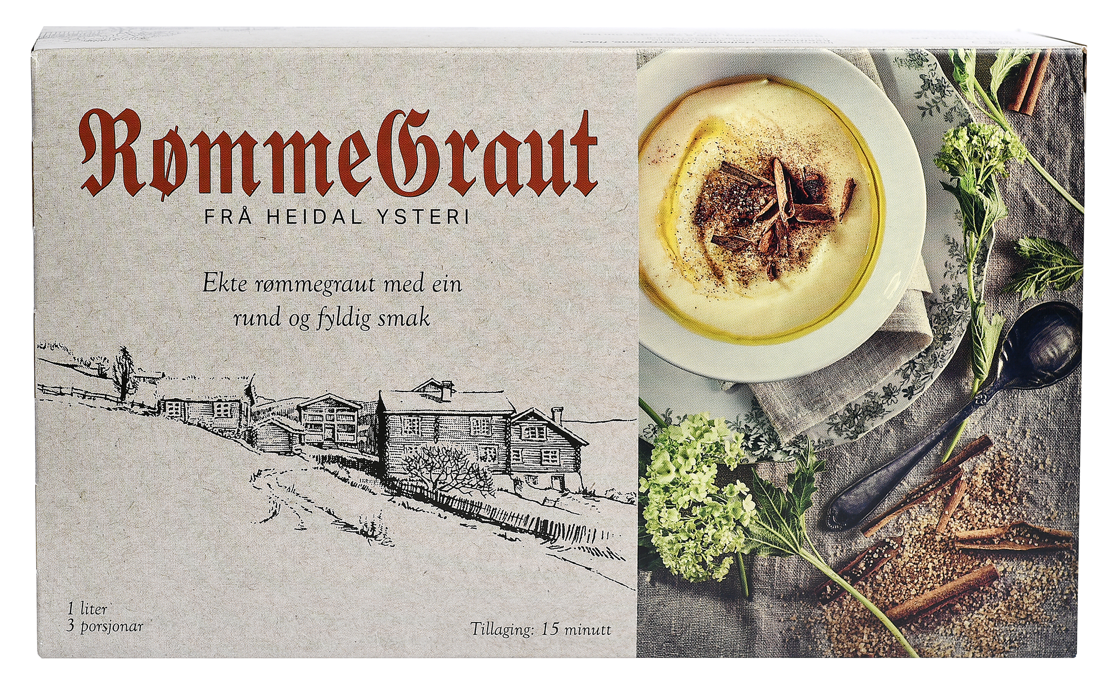 Rømmegrøt kokt med stolthet og tradisjon fra Heidal Ysteri i Gudbrandsdalen. Grøten har en fyldig, lys gul og fløyelsaktig konsistens. Rømmegrøt og spekemat har en lang tradisjon i Norge, og serveres til hverdag og større anledninger. Server rømmegrøten godt oppvarmet med kanel, sukker og fettet fra kokingen, som kommer i en egen boks. Spekemat, flatbrød og rømme serveres gjerne etter grøten. Denne pakningen på 1 liter rømmegraut gir 3 porsjoner.