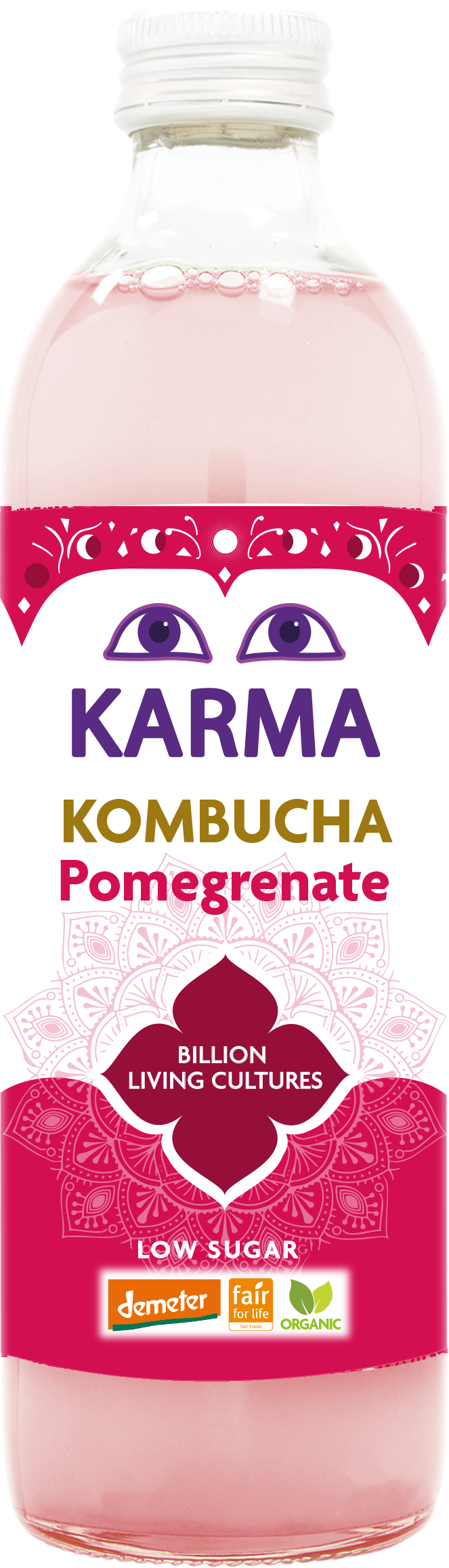 | Ingredienser | Karma Kombucha (filtrert vann, lyst rørsukker * fra Paraguay, grønn te * fra India, kambouchakultur *) 93,3%, hibiscusinfusjon *, granateplejuice * 1,4%, bringebærpué *, ingefærjuice *. *Økologisk. |