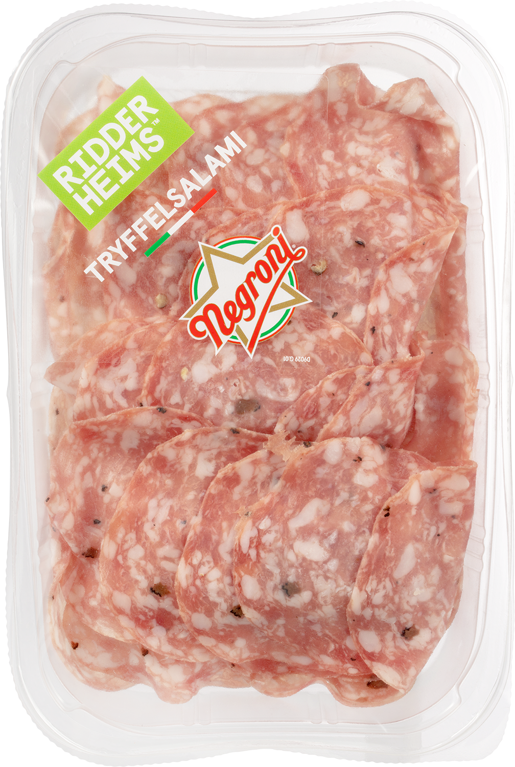 Negroni salami med trøffel er en italiensk spekepølse laget av svinekjøtt og krydder, tilsatt ekte trøffel for en karakteristisk smak. Negroni salami med trøffel byr på en balansert smaksopplevelse som gjør seg like godt på tapasbordet som i enkle hverdagsretter.