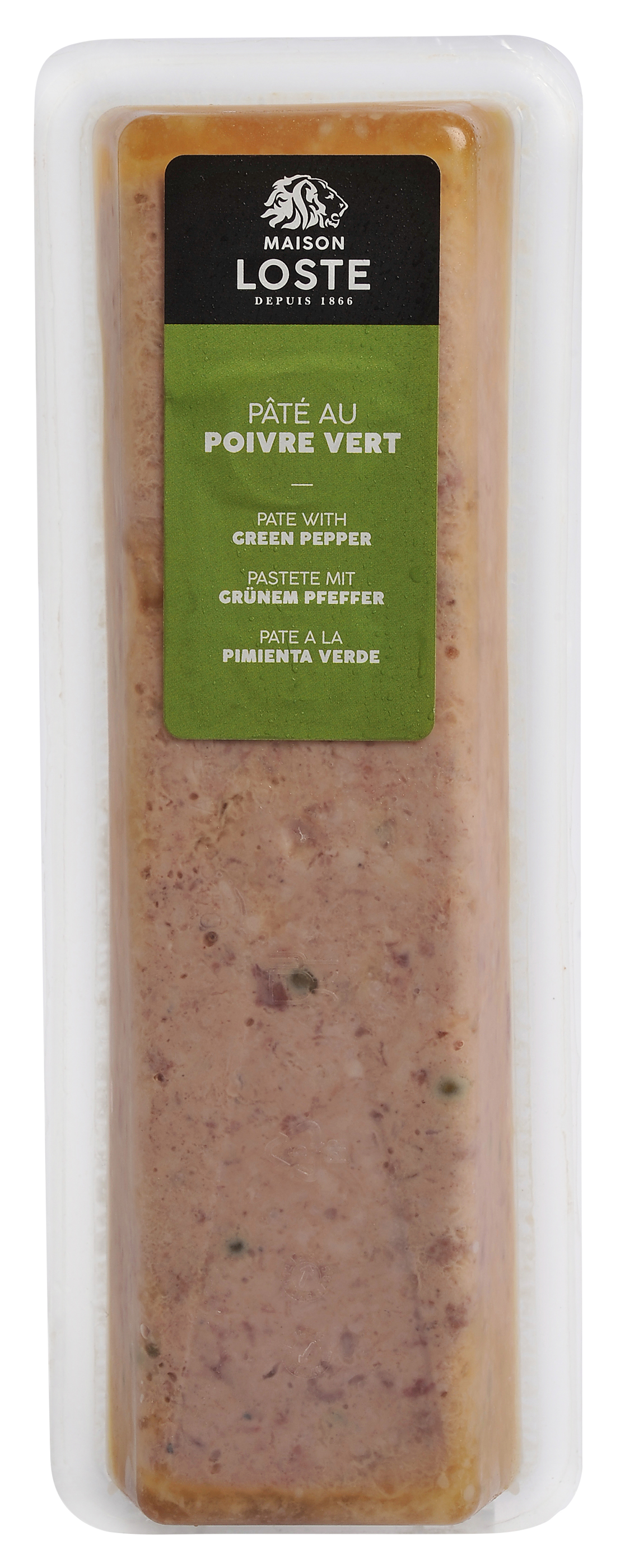 | Ingredienser | Svinekjøtt, svinelever, svinefett, grønne pepperkorn 3% (tilsatt surhetsregulerende middel: eddiksyre E260), vann, denaturert armagnac (armagnac, salt, naturlig aroma), eggehvite, aroma, svinesvor, potetstivelse, salt, konserveringsmiddel: natriumnitritt E250, laktose, melkeproteiner, fløte (melk), salt, naturlig pepperaroma, løk, stabilisator: trifosfat E451, dekstrose, muskat, antioksidant: natriumerytorbat E316. Garnityr: vann, gelatin fra storfe, salt, aroma, fargestoff: karamell E150a, konserveringsmiddel: kaliumsorbat E202, natriumlaktat E325, oment fra svin, svineblod. |