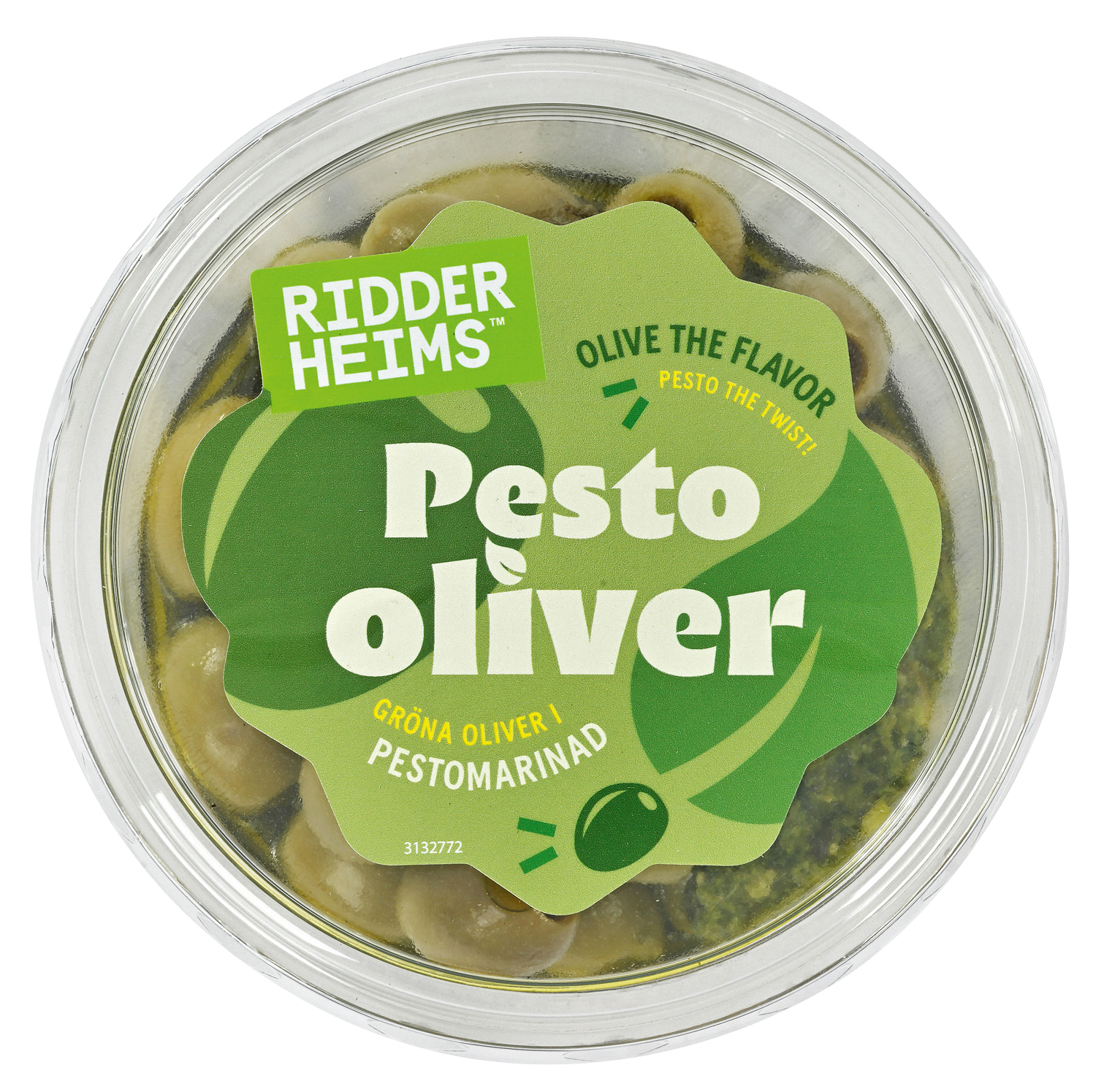| Ingredienser | Grønne oliven uten sten 50%, basilikumkrem 18% (basilikum, solsikkeolje, salt, antioksidant: askorbinsyre E300), rapsolje, pesto 8,3% (solsikkeolje, basilikum, potetflak, olivenolje, ost (melk, salt, løpe, konserveringsmiddel: lysozym fra egg), pinjekjerner, hvitløk, salt, konserveringsmiddel: melkesyre E270), basilikum, hvitløk, ost (melk, salt, løpe, konserveringmiddel: lysozym E1105 fra egg, antioksidant: askorbinsyre E300, konserveringsmidde: natriumbenzoat E211, sorbinsyre E200. |