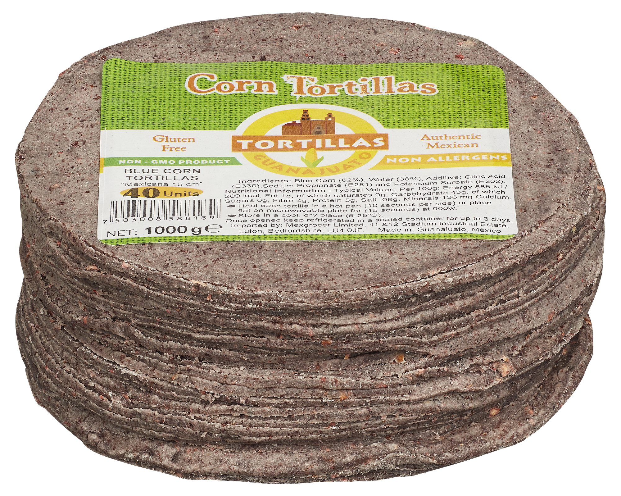 Denne gourmet tortillaen er bakt på ekte meksikansk vis hvor hovedingrediensen er blått maismel. Vakuumpakket for å bevare sin konsistens og autentiske smak. Blå mais stammer fra nord i Mexico og gir lefsene den særegne fargen. Det er 40 lomper i én pakke.
