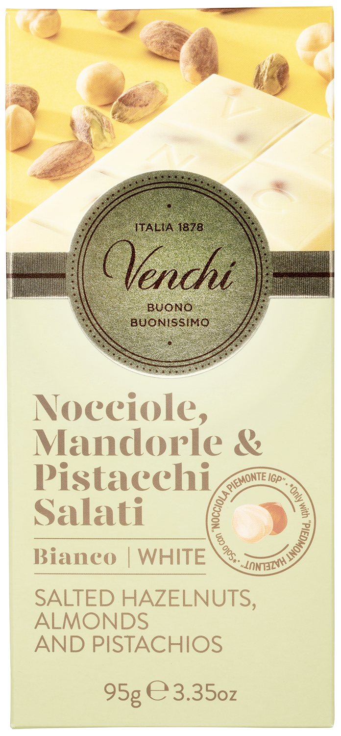 | Ingredienser | Sukker, kakaosmør, helmelkspulver, saltede mandler 10% (mandler 98,5%, salt), saltede Piedmont hasselnøtter 10% (hasselnøtter 98,7%, salt), saltede pistasjnøtter 5% (pistasjnøtter 98,7%, salt), mysepulver (melk), emulgator: soyalecitin E322, naturlig vaniljearoma. |